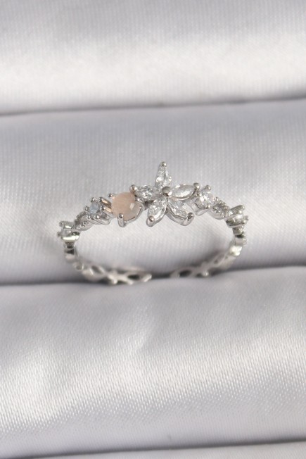 Pirinç Gümüş Renk Zirkon Taşlı Çiçek Model Ayarlanabilir Yüzük - 259981