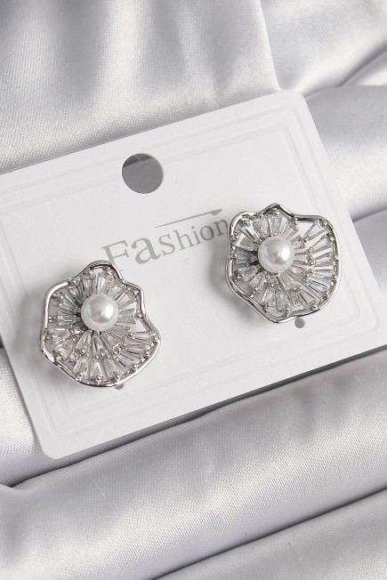 Pirinç Gümüş Renk Zirkon Taşlı Çiçek Model İnci Detay Kadın Küpe - 259893