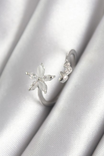 Pirinç Gümüş Renk Zirkon Taşlı Çiçek Model Kalp Detay Kadın Yüzük - 253869