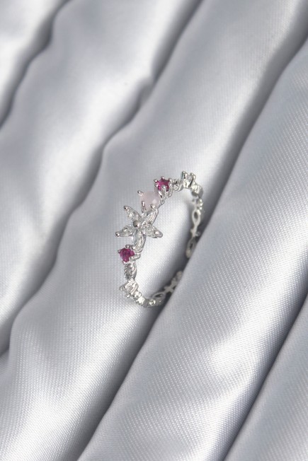 Pirinç Gümüş Renk Zirkon Taşlı Çiçek Model Pembe Zirkon Taş Detay Kadın Yüzük - 252951