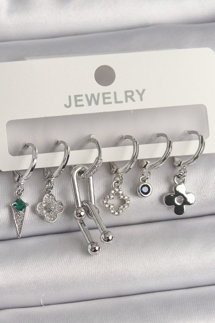 Pirinç Gümüş Renk Zirkon Taşlı Çoklu Figür Kadın Küpe Seti - 260409