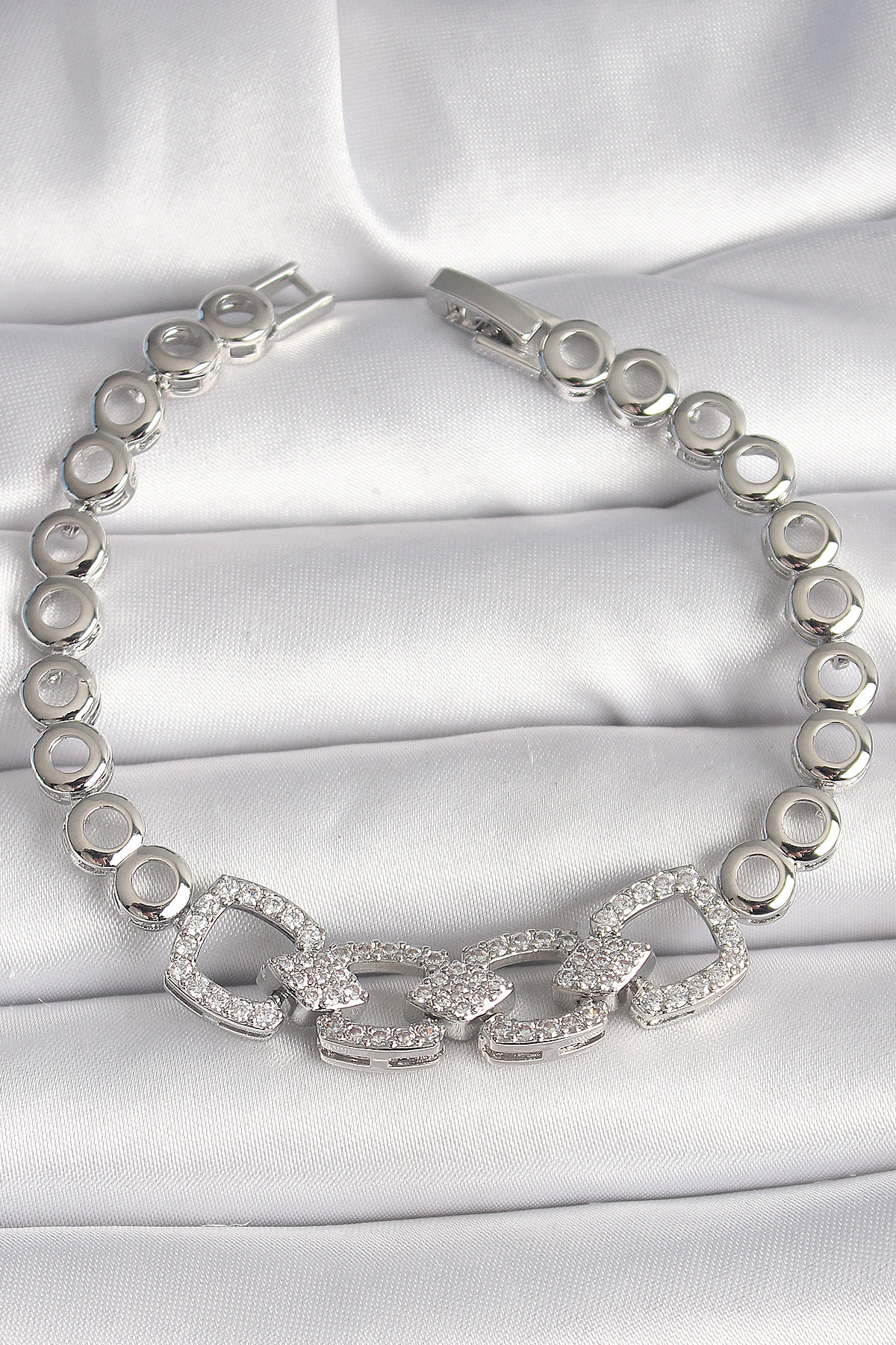 Pirinç Gümüş Renk Zirkon Taşlı Daire Zincir Model Kadın Bileklik - 261052