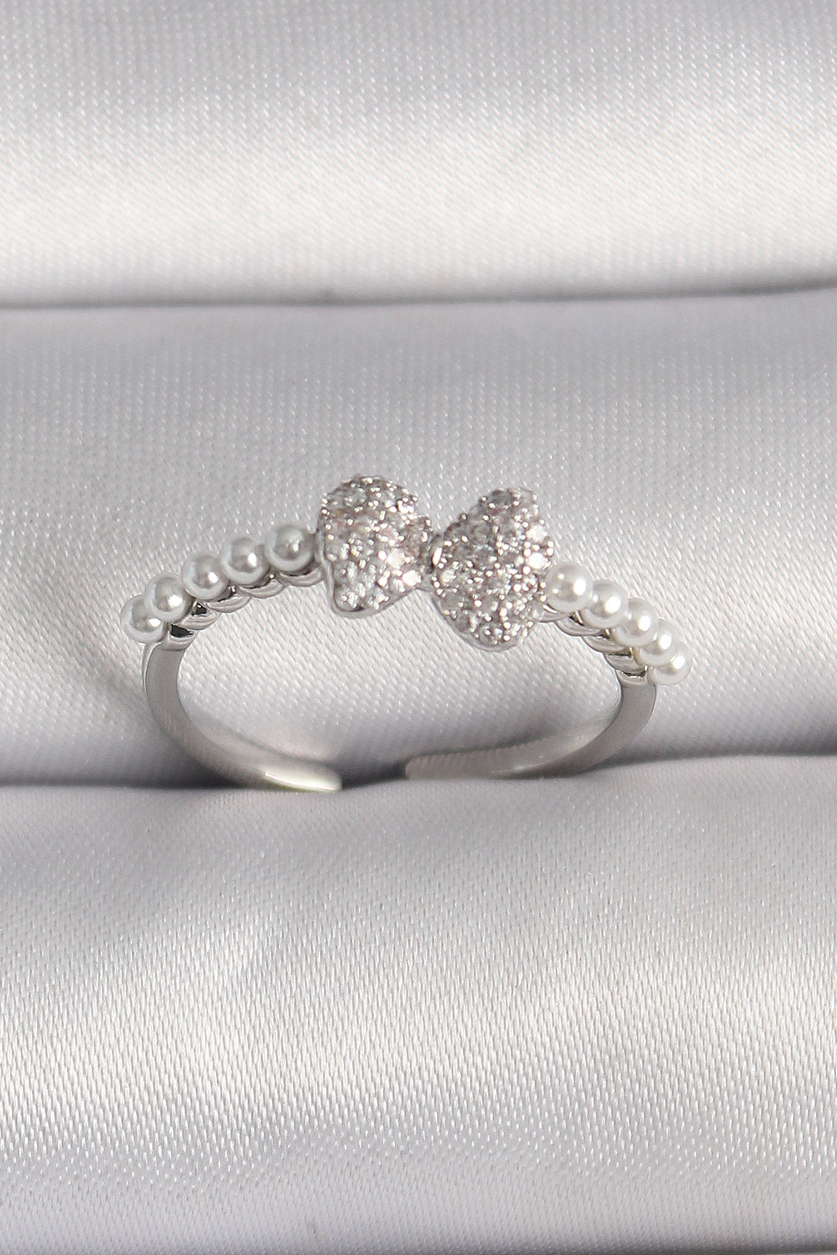 Pirinç Gümüş Renk Zirkon Taşlı Fiyonk İnci Detay Ayarlanabilir Yüzük - 259943