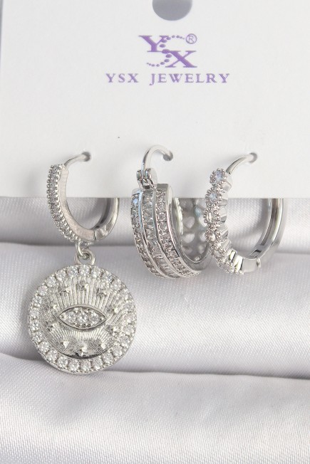 Pirinç Gümüş Renk Zirkon Taşlı Göz İşlemeli Halka Model 3'Lü Kadın Kombin Küpe - 261916