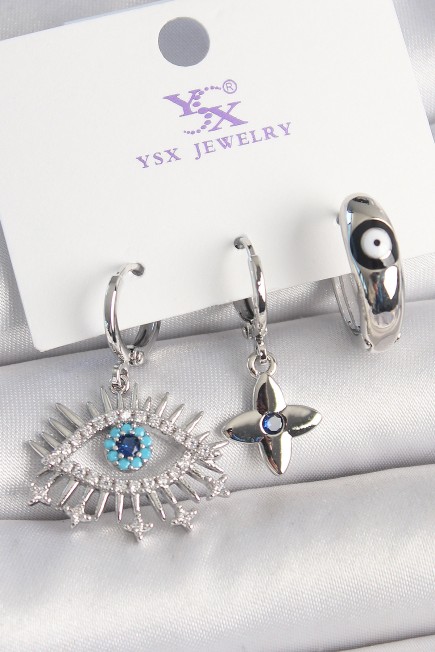 Pirinç Gümüş Renk Zirkon Taşlı Göz Model Nazar Boncuk Detay 3'Lü Kadın Kombin Küpe - 261920