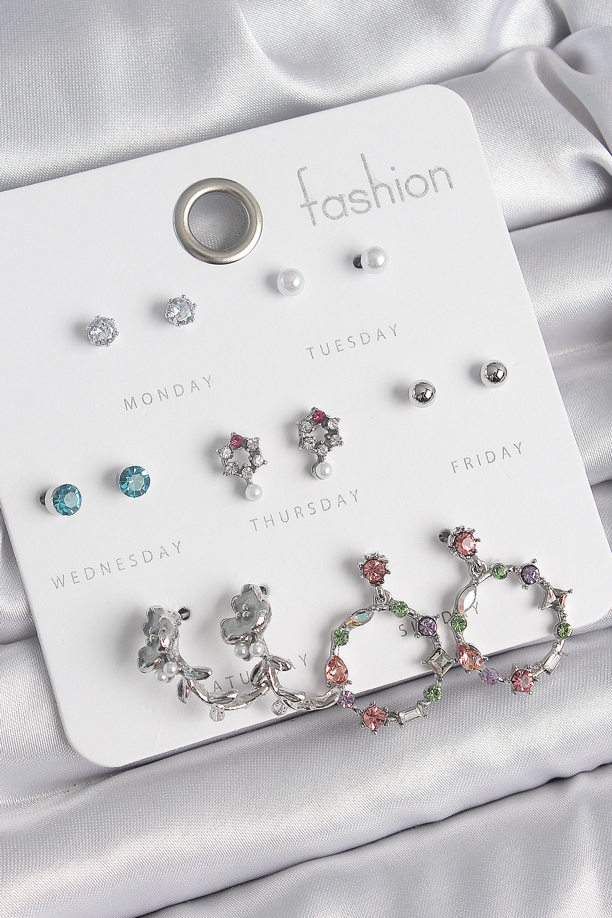 Pirinç Gümüş Renk Zirkon Taşlı Gül Figür Halka Model 7 Çift Kadın Küpe Seti - 262497