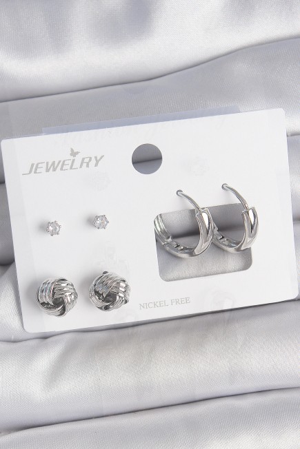 Pirinç Gümüş Renk Zirkon Taşlı Halka Model 3 Çift Kadın Küpe Seti - 262623