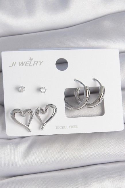 Pirinç Gümüş Renk Zirkon Taşlı Halka Model Kalp Detay 3 Çift Kadın Küpe Seti - 262626