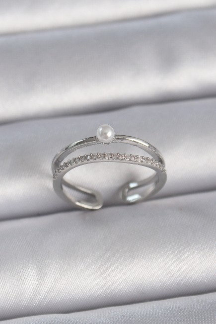 Pirinç Gümüş Renk Zirkon Taşlı İnci Detay Ayarlanabilir Model Kadın Yüzük - 258708
