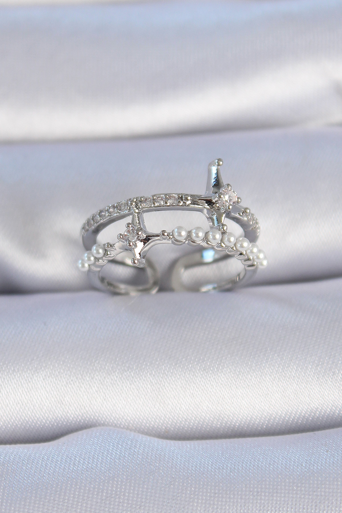 Pirinç Gümüş Renk Zirkon Taşlı İnci Detay Kutup Yıldızı Model Kadın Yüzük - 257855