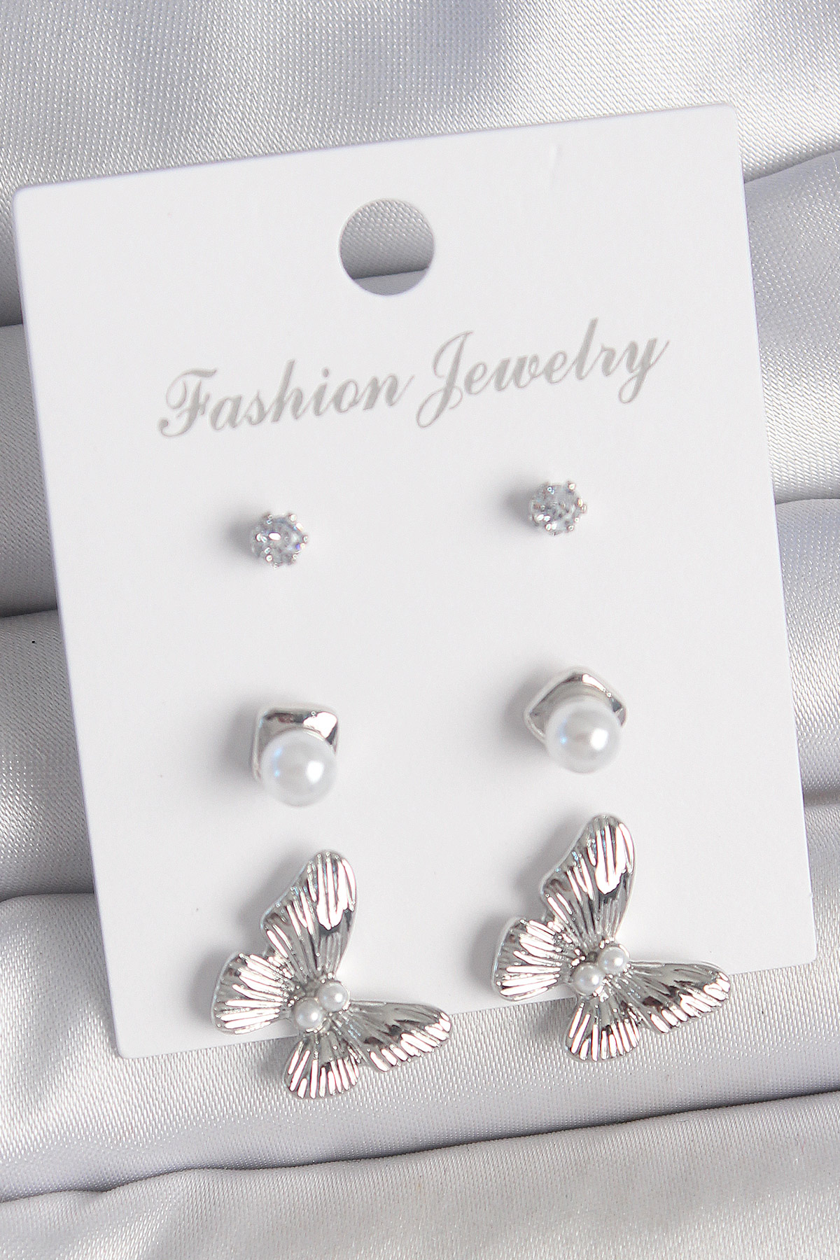 Pirinç Gümüş Renk Zirkon Taşlı İnci Detaylı Kelebek Model 3 Çift Kadın Küpe Seti - 262621