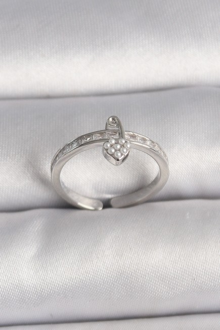 Pirinç Gümüş Renk Zirkon Taşlı İnci Detaylı Kilit Kalp Model Ayarlanabilir Yüzük - 259955