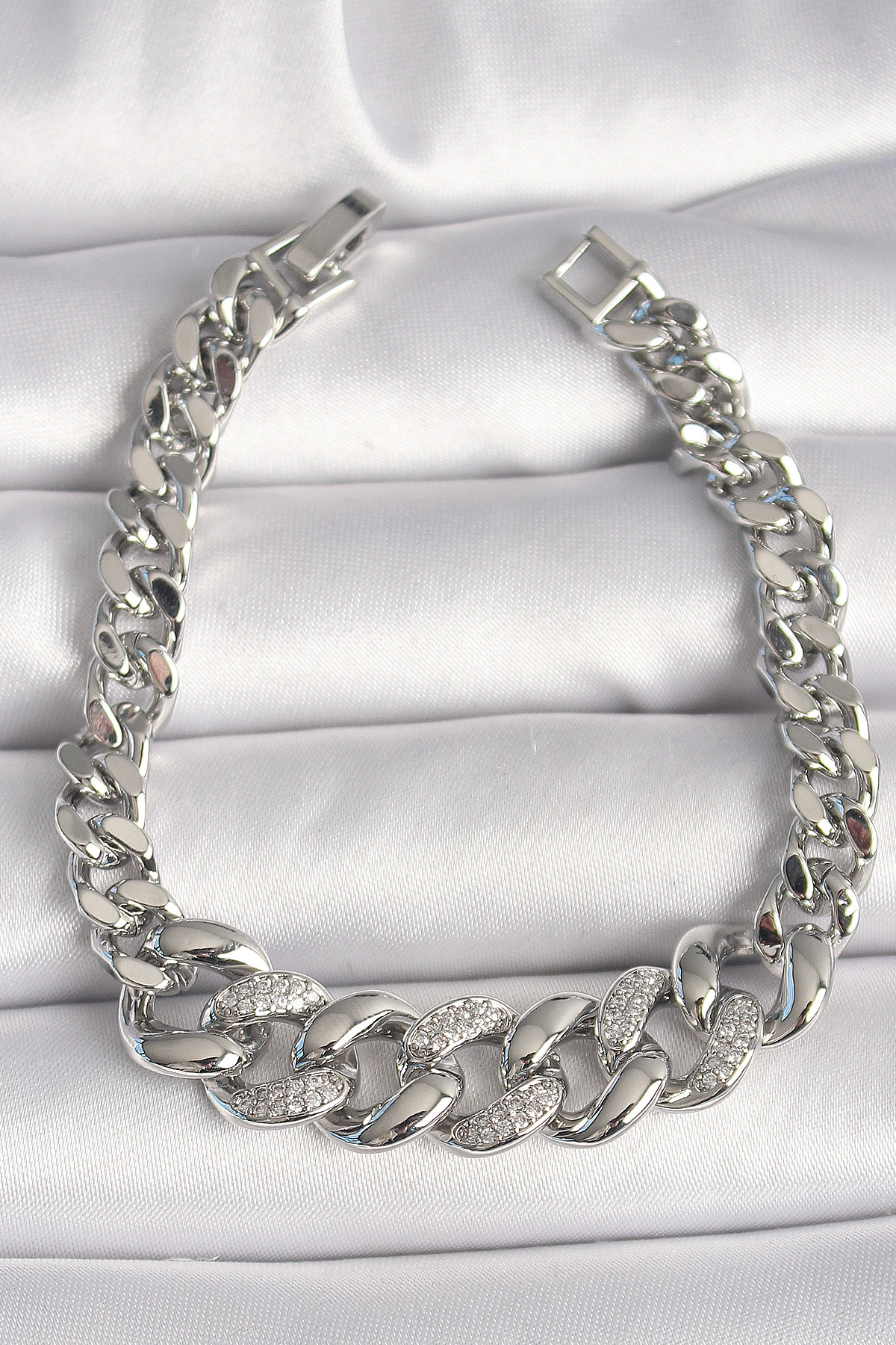 Pirinç Gümüş Renk Zirkon Taşlı Kalın Halka Model Kadın Bileklik - 261063