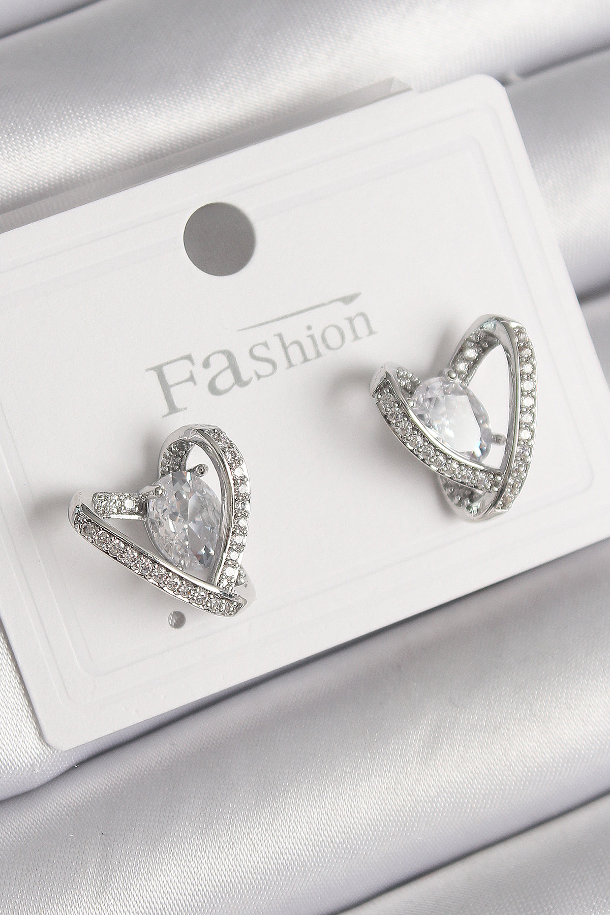 Pirinç Gümüş Renk Zirkon Taşlı Kalp Model Kadın Küpe - 259305