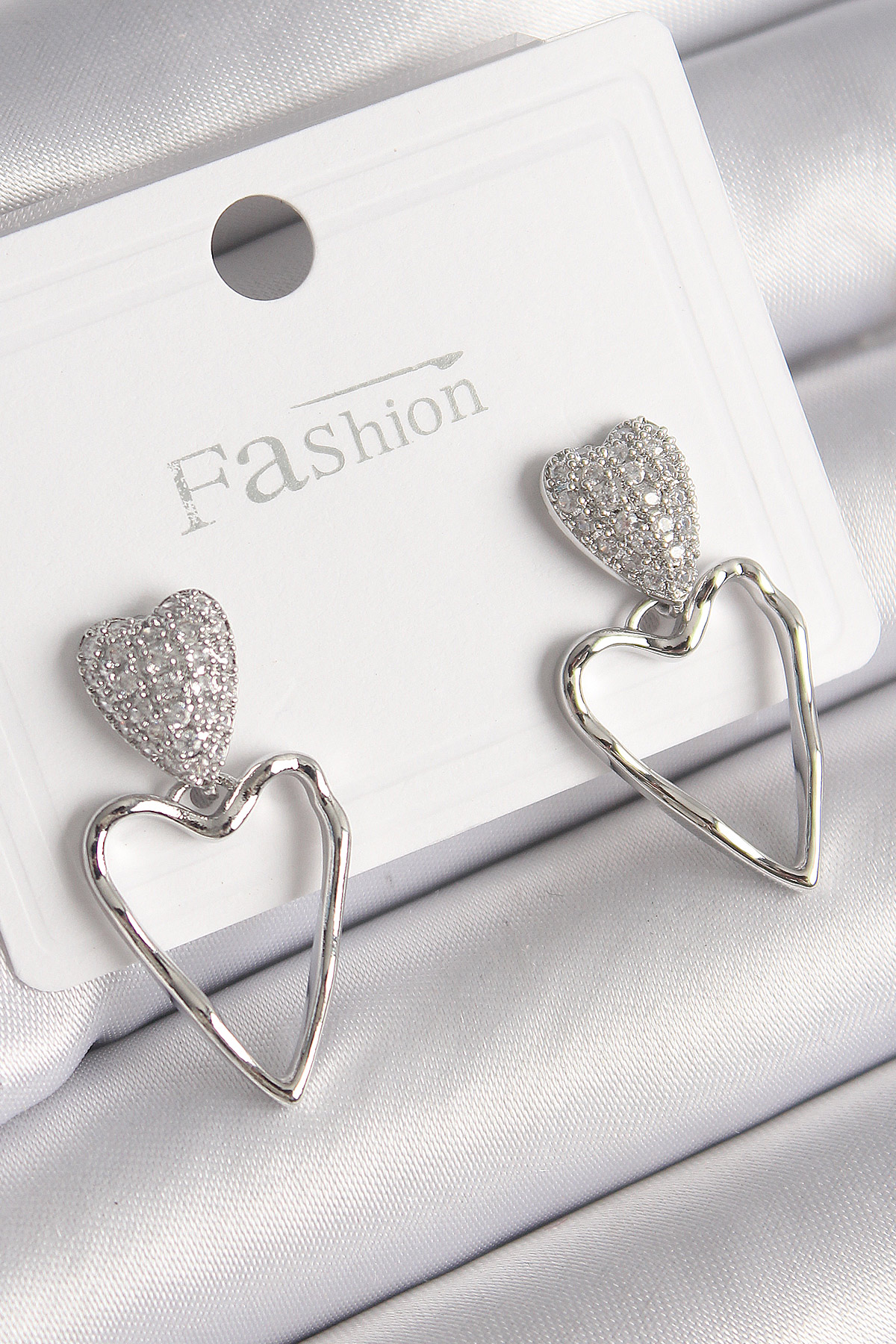 Pirinç Gümüş Renk Zirkon Taşlı Kalp Model Kadın Küpe - 259327