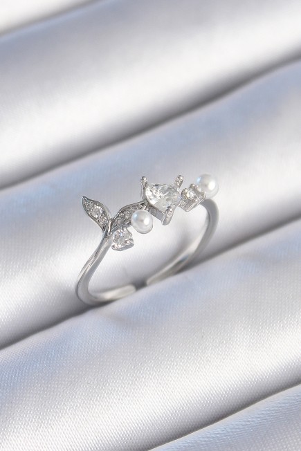 Pirinç Gümüş Renk Zirkon Taşlı Kalp Yaprak Model İnci Detay Kadın Yüzük - 259154