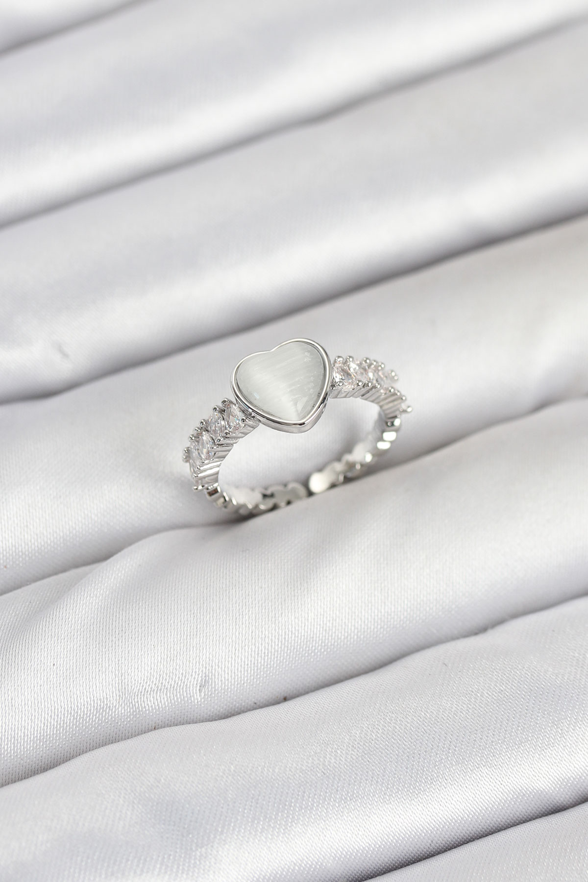 Pirinç Gümüş Renk Zirkon Taşlı Kalpli Kadın Yüzük - 265792
