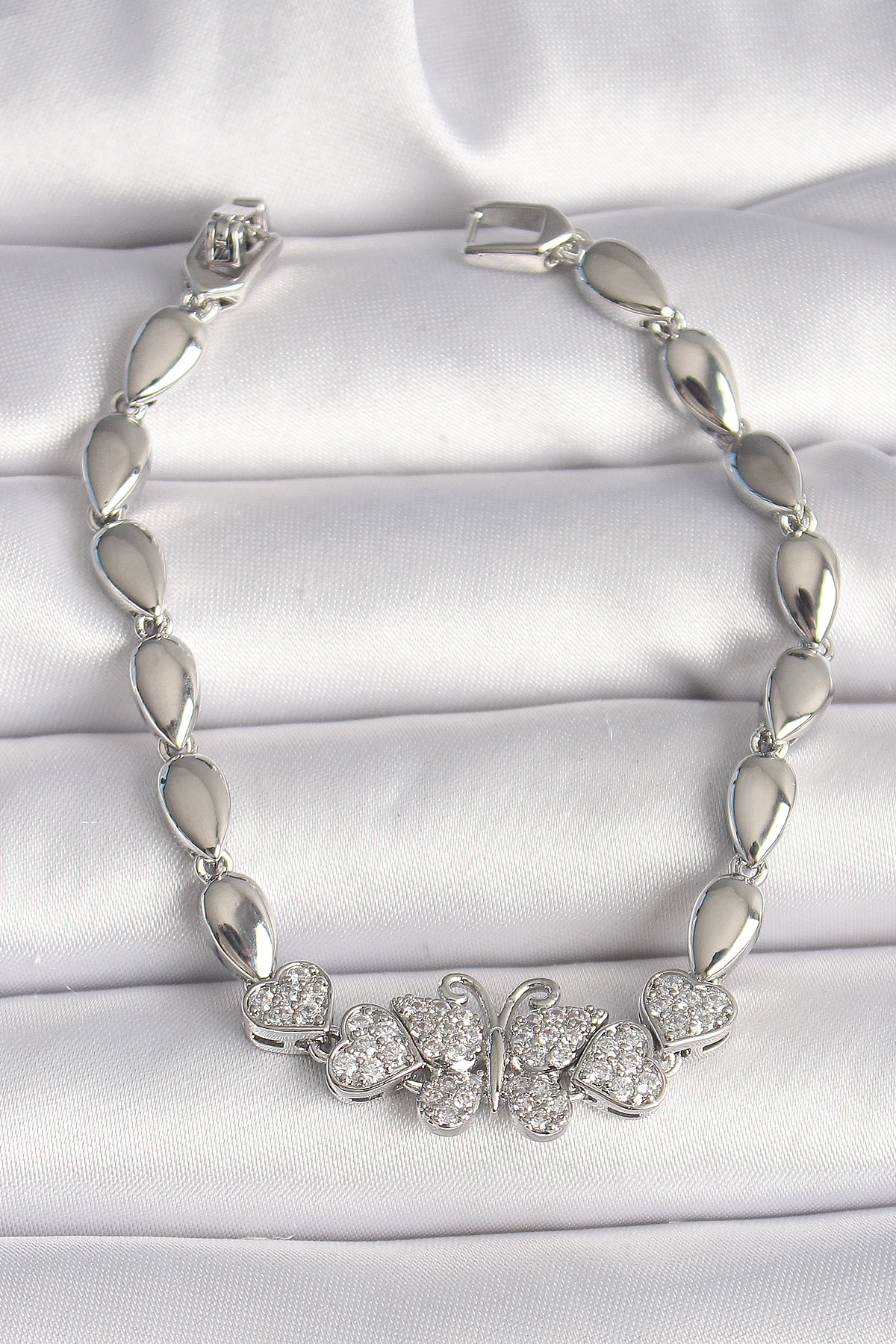 Pirinç Gümüş Renk Zirkon Taşlı Kelebek Figür Damla Zincir Model Kadın Bileklik - 261050