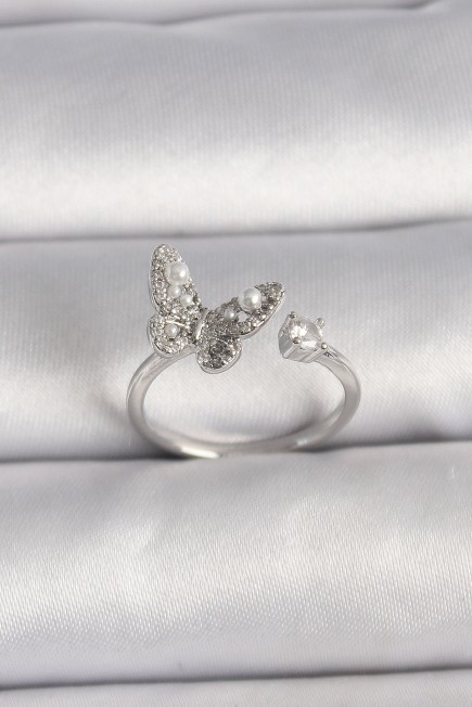 Pirinç Gümüş Renk Zirkon Taşlı Kelebek Model İnci Detay Ayarlanabilir Yüzük - 259951