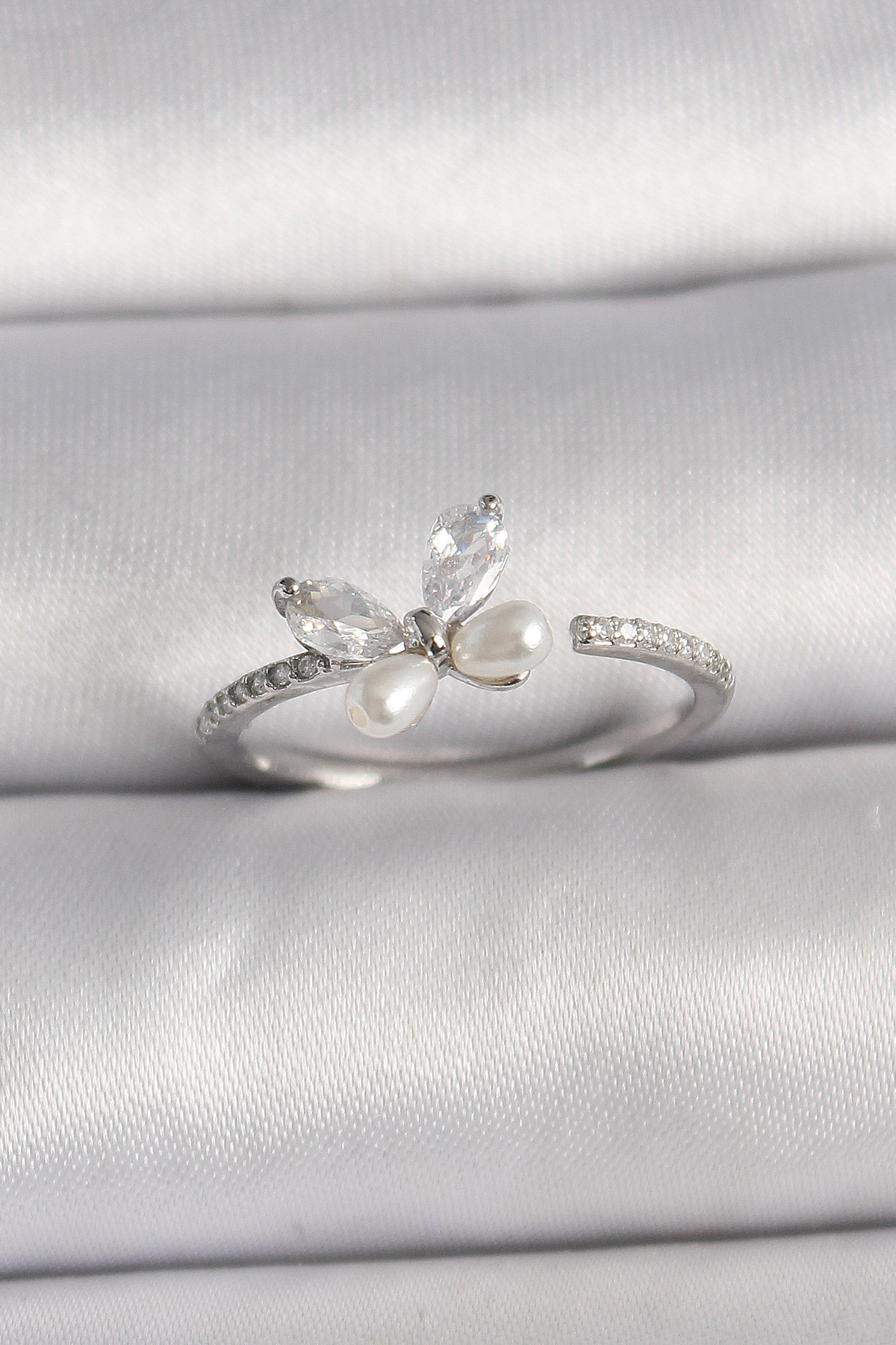 Pirinç Gümüş Renk Zirkon Taşlı Kelebek Model İnci Detaylı Ayarlanabilir Yüzük - 259975