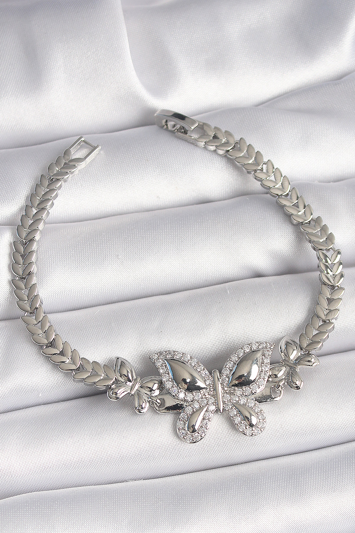 Pirinç Gümüş Renk Zirkon Taşlı Kelebek Model Kadın Bileklik - 261024