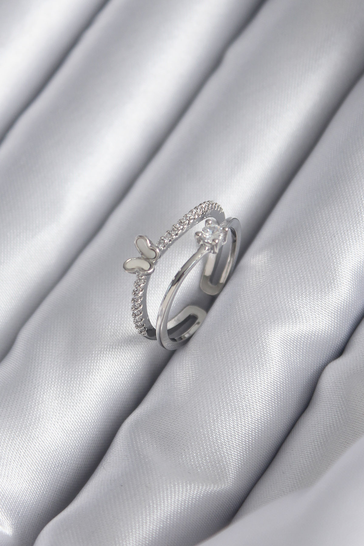Pirinç Gümüş Renk Zirkon Taşlı Kelebek Model Kadın Yüzük - 252449