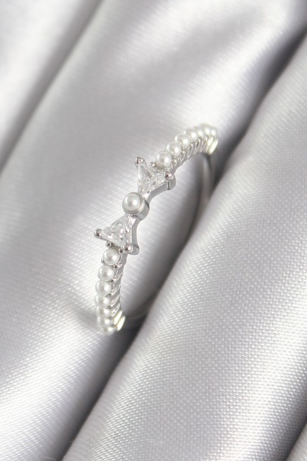 Pirinç Gümüş Renk Zirkon Taşlı Kurdele Model İnci Detay Kadın Yüzük - 253859