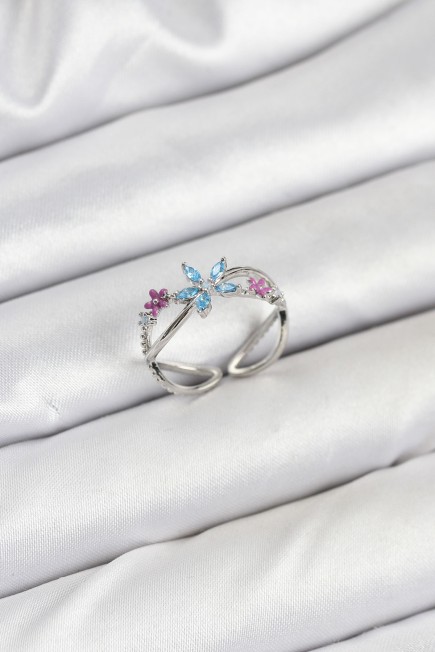 Pirinç Gümüş Renk Zirkon Taşlı Mavi Çiçekli Kadın Yüzük - 265770
