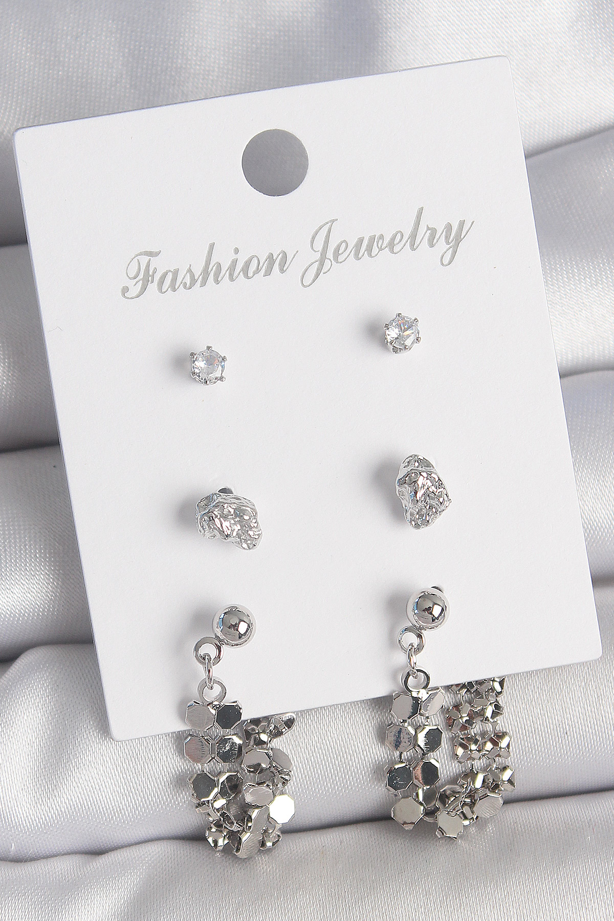 Pirinç Gümüş Renk Zirkon Taşlı Pullu Sallantılı Model 3 Çift Kadın Küpe Seti - 262615