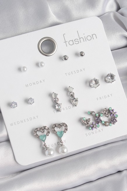 Pirinç Gümüş Renk Zirkon Taşlı Sallantılı Kalp Model Çiçek Detay 7 Çift Kadın Küpe Seti - 262499