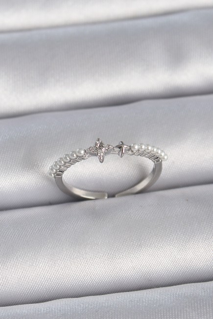 Pirinç Gümüş Renk Zirkon Taşlı Sıralı İnci Ayarlanabilir Model Kadın Yüzük - 258704