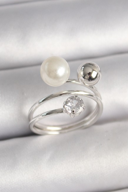 Pirinç Gümüş Renk Zirkon Taşlı Toplu İnci Model Kadın Yüzük - 261317