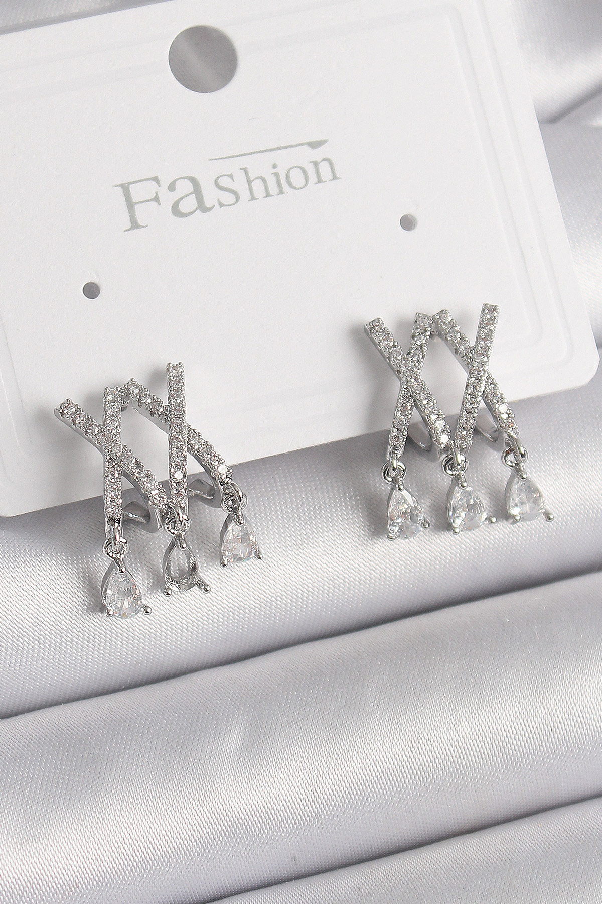 Pirinç Gümüş Renk Zirkon Taşlı X Model Sallantı Detay Kadın Küpe - 259564