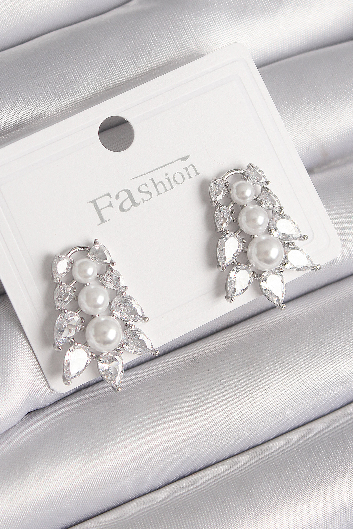 Pirinç Gümüş Renk Zirkon Taşlı Yaprak Model İnci Detay Kadın Küpe - 259345