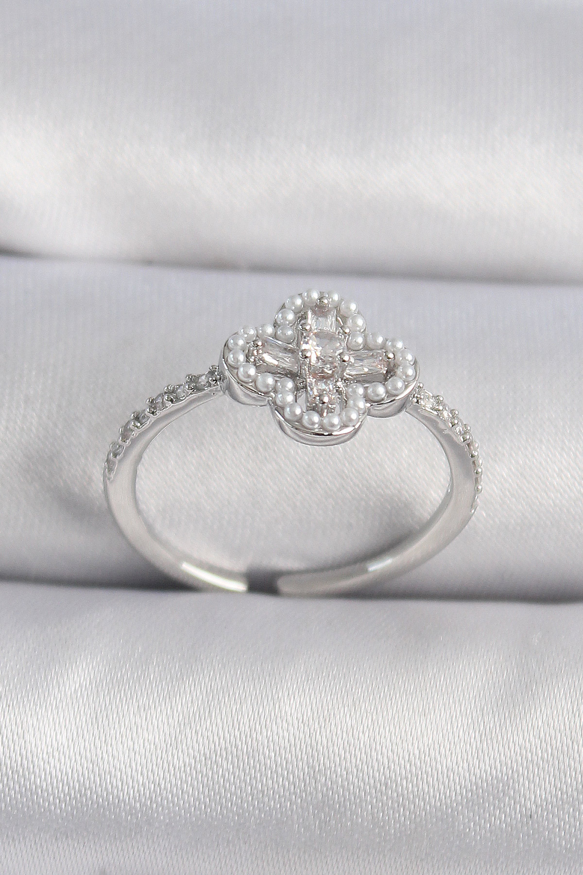 Pirinç Gümüş Renk Zirkon Taşlı Yonca Model İnci Detay Kadın Yüzük - 259402