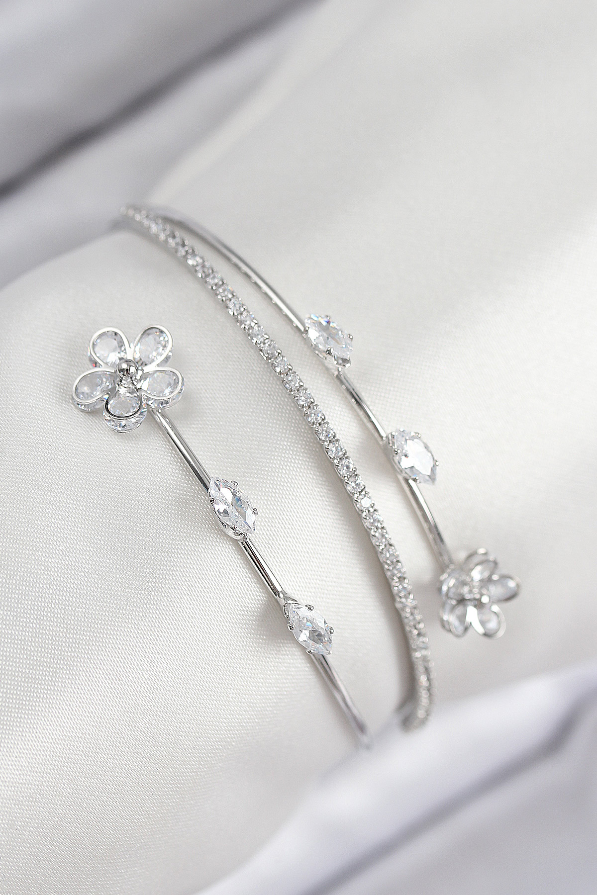 Pirinç Zirkon Taşlı Çiçek Model Gümüş Renk Kadın Bileklik - 265522
