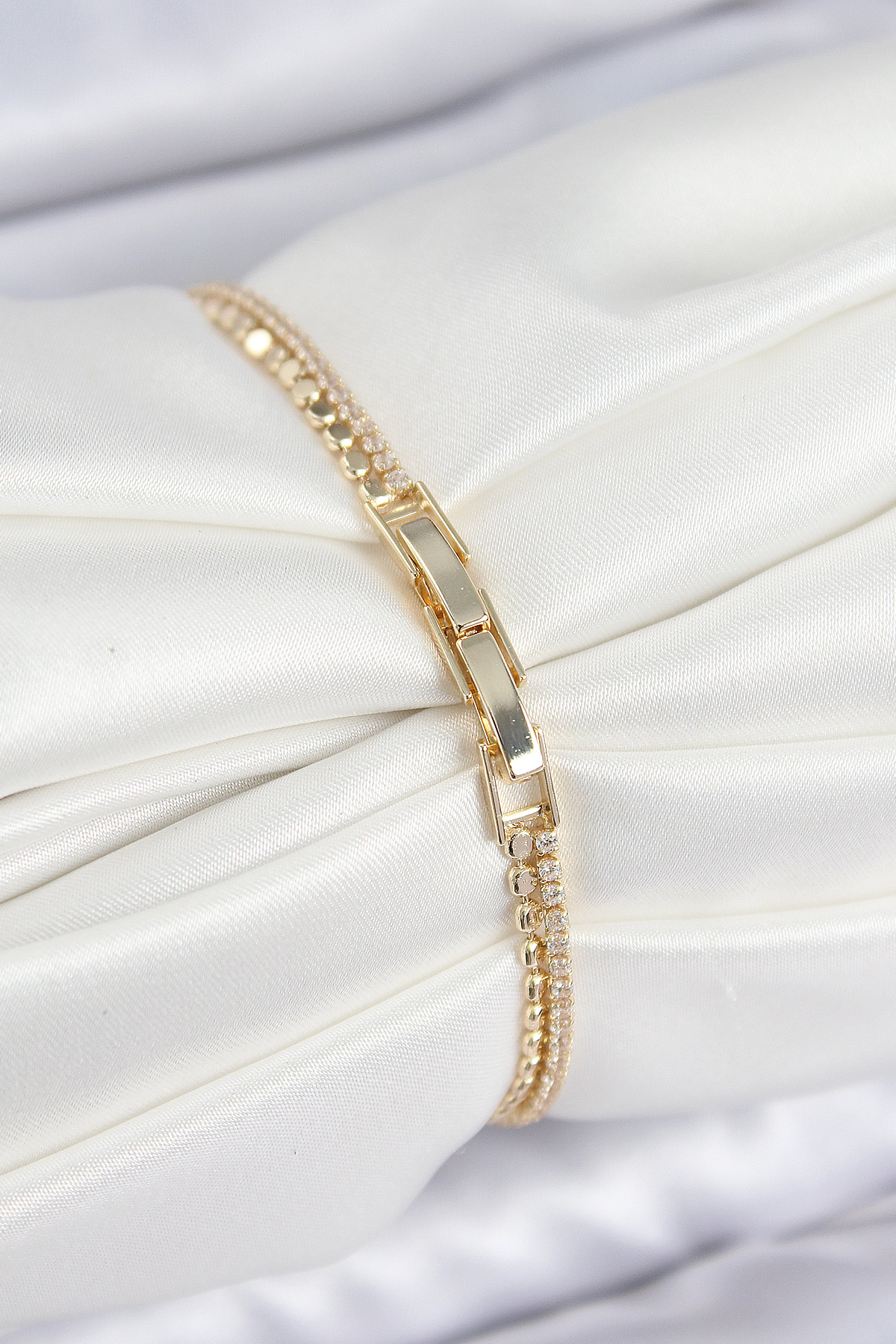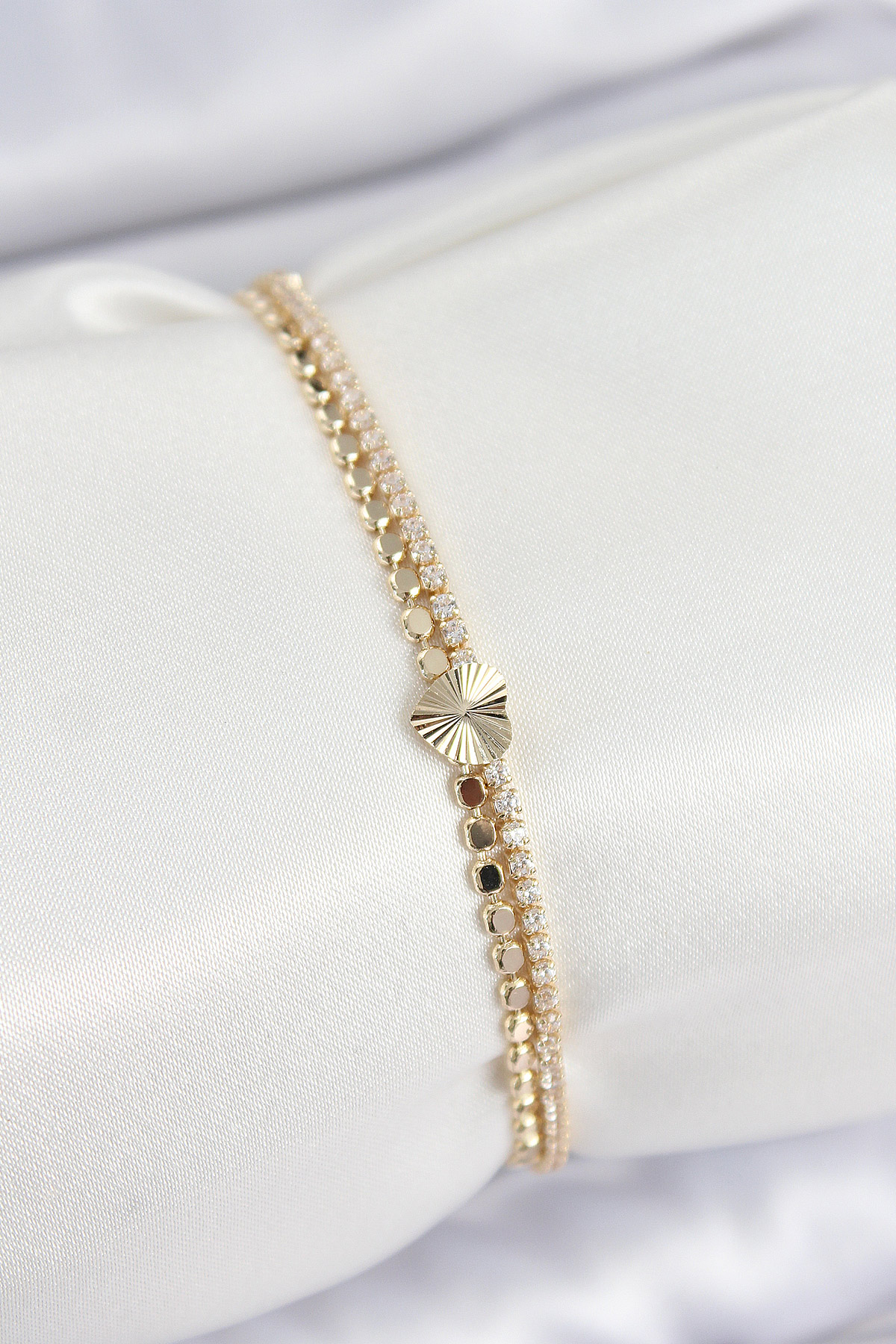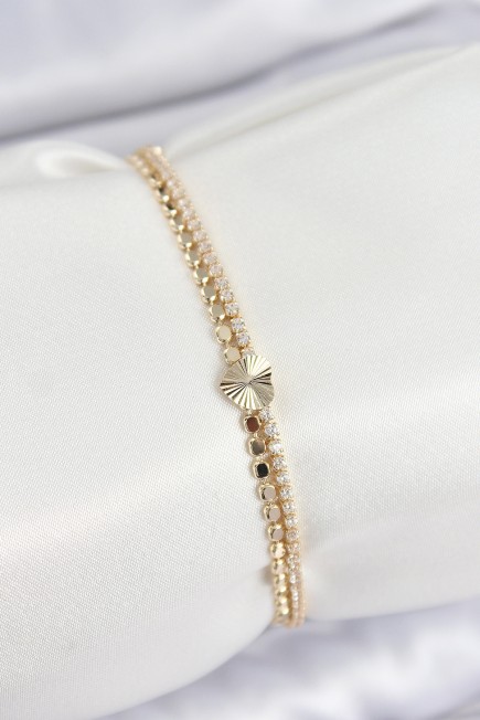 Pirinç Zirkon Taşlı Ezme Zincirli Kalp Model Gold Renk Kadın Bilekilk - 264684