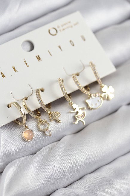 Pirinç Zirkon Taşlı Hello Kity Ve Yonca Model Gold Renk 6'lı Küpe Set - 265229