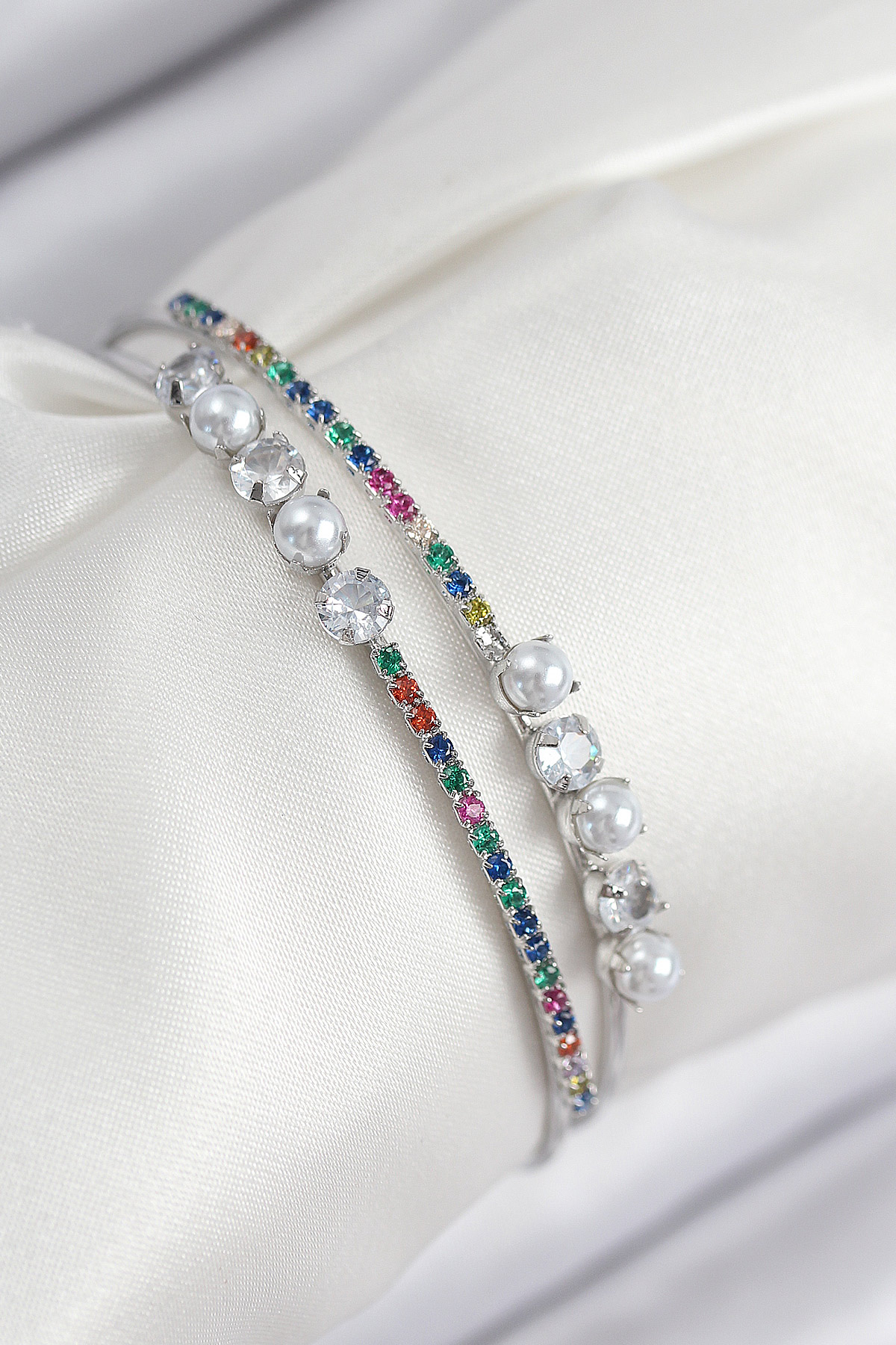 Pirinç Zirkon Taşlı İnci Model Gümüş Renk Kadın Bileklik - 265538