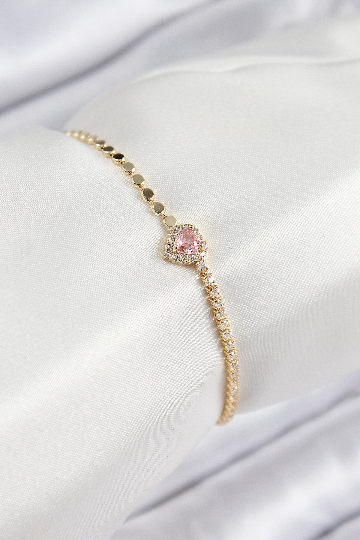 Pirinç Zirkon Taşlı Kalp Model Ezme Zincir Gold Renk Kadın Bileklik - 264463