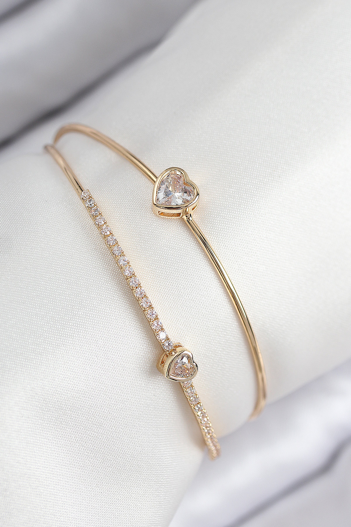 Pirinç Zirkon Taşlı Kalp Model Gold Renk Kadın Bileklik - 265531