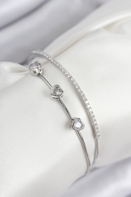 Pirinç Zirkon Taşlı Kalp Model Gümüş Renk Kadın Bileklik - 265524