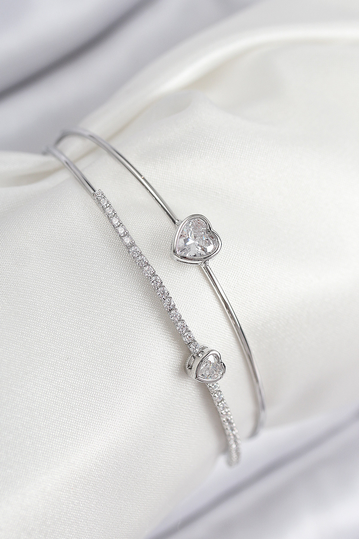 Pirinç Zirkon Taşlı Kalp Model Gümüş Renk Kadın Bileklik - 265532
