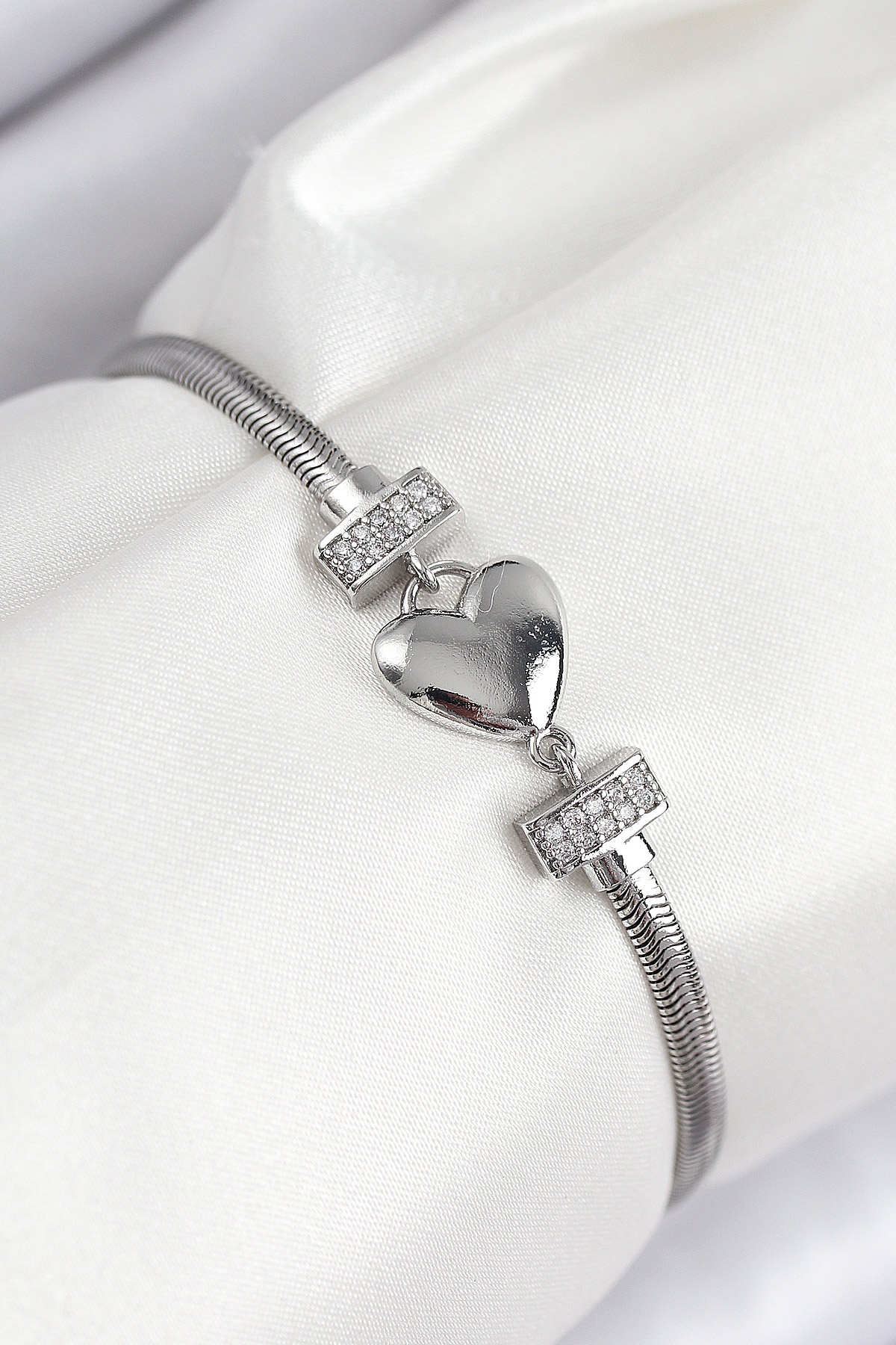 Pirinç Zirkon Taşlı Kalp Model Gümüş Renk Kadın Bileklik - 265562
