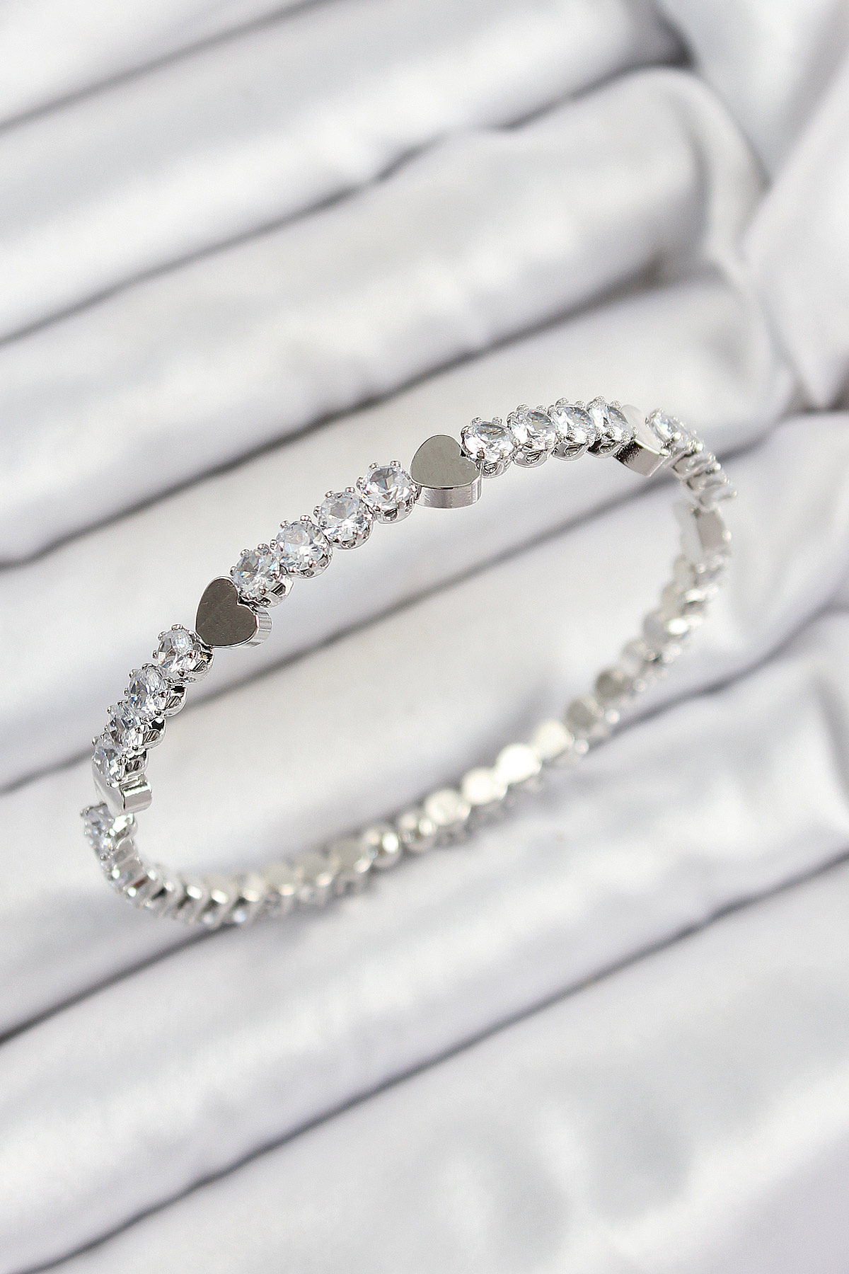 Pirinç Zirkon Taşlı Kalp Model Gümüş Renk Yaylı Kadın Bileklik - 263469