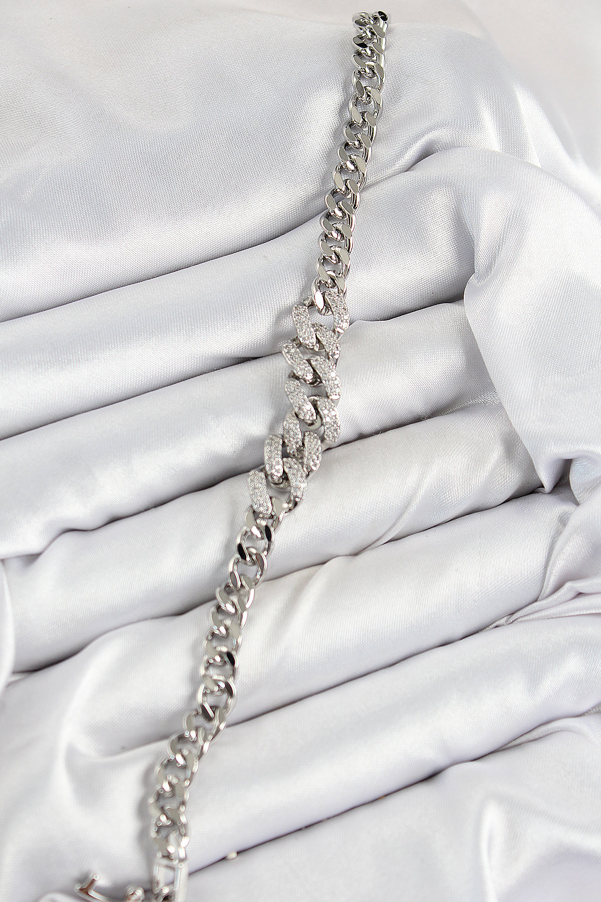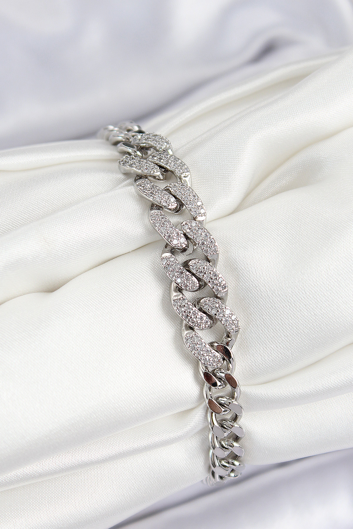 Pirinç Zirkon Taşlı Küba Zincir Model Gümüş Renk Kadın Bileklik - 264379