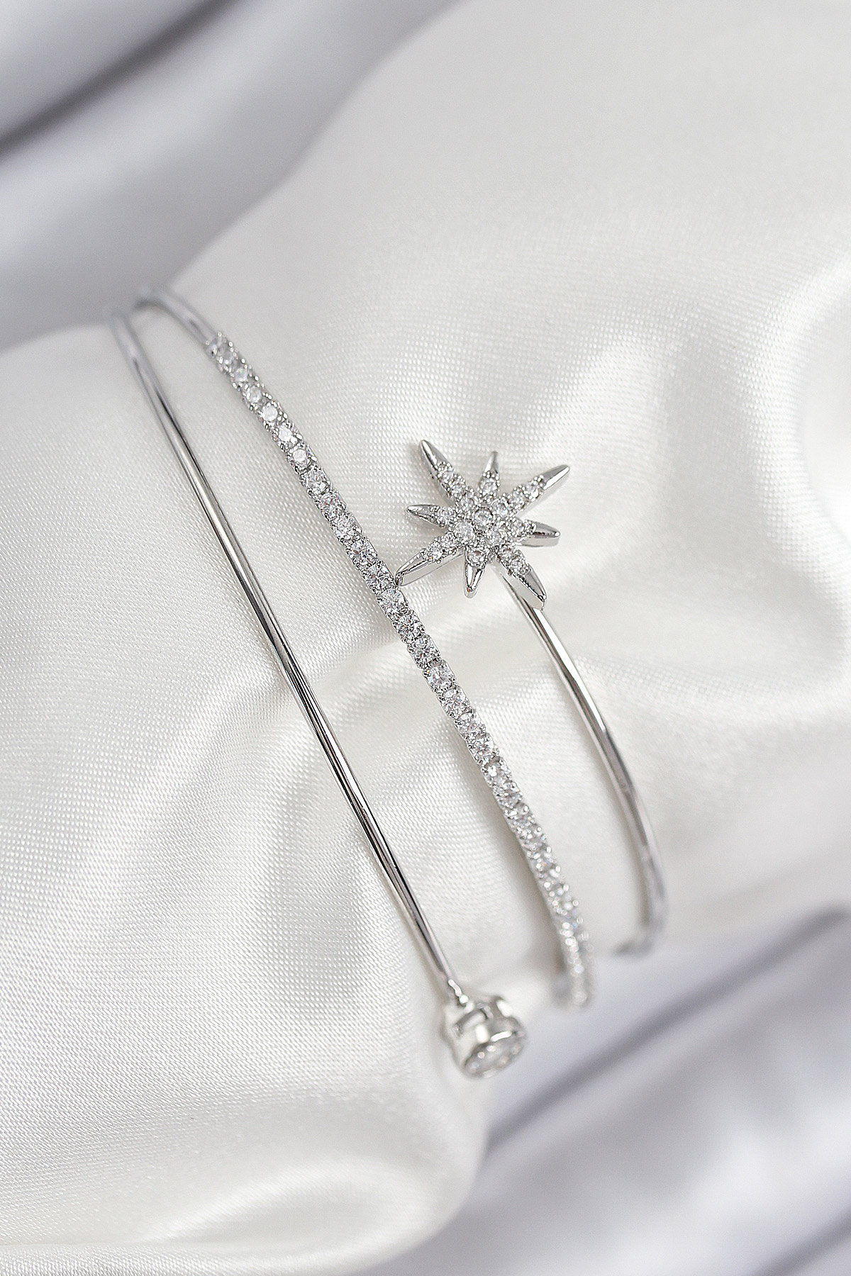 Pirinç Zirkon Taşlı Kutup Yıldızı Model Gümüş Renk Kadın Bileklik - 265550