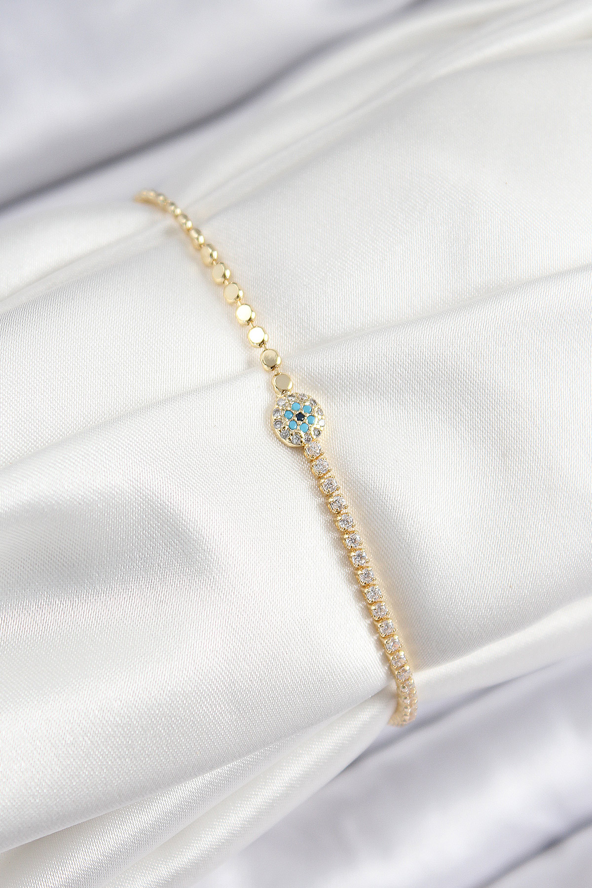 Pirinç Zirkon Taşlı Nazar Model Ezme Zincir Gold Renk Kadın Bileklik - 264461