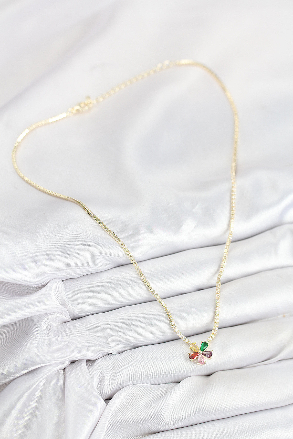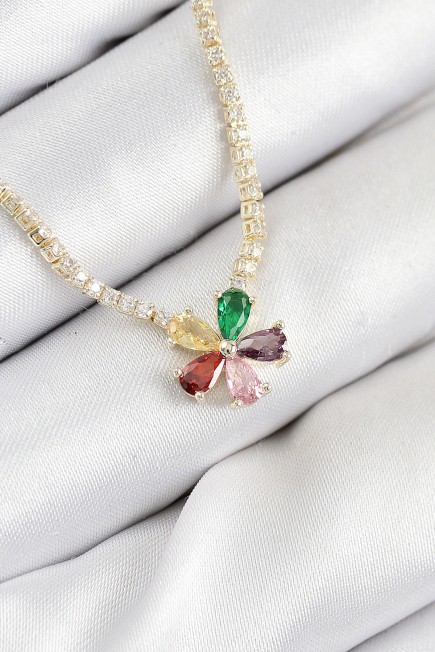 Pirinç Zirkon Taşlı Su Yolu Asorti Çiçek Model Gold Renk Kadın Kolye - 265569