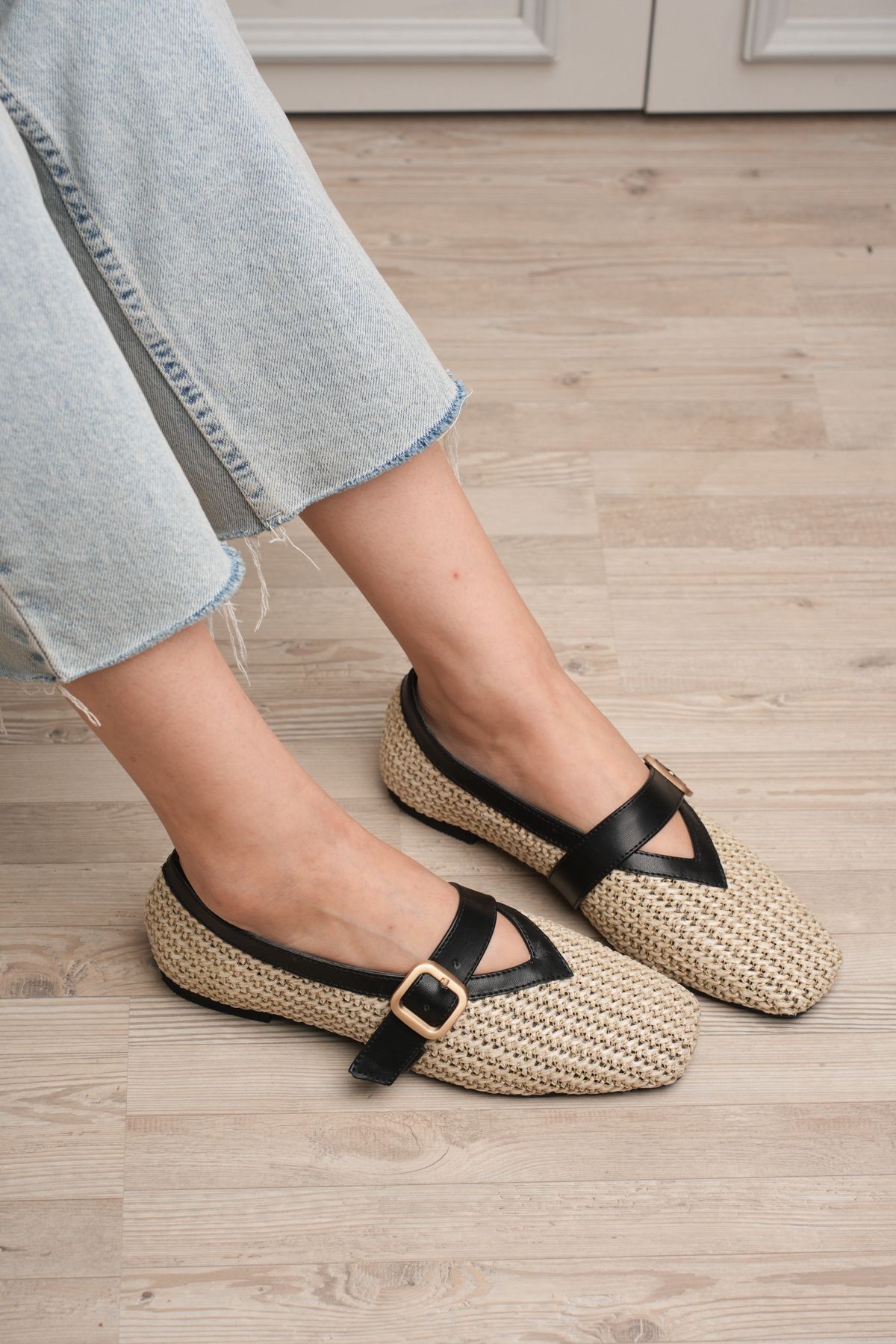 Ponti Siyah Cilt Hasır Detaylı Babet Ayakkabı - 268446